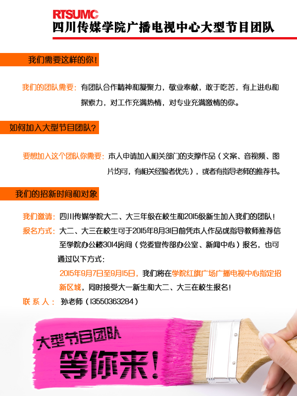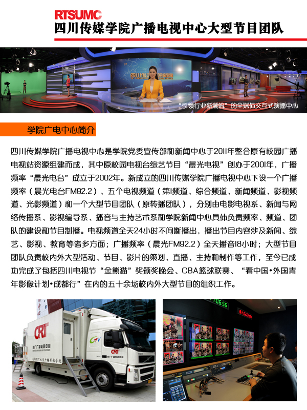 四川传媒学院广播电视中心大型节目团队的前身是四川传媒学院转播团队,新团队将努力打造集节目创意、现场直播、影视后期特技特效、主播主持、新媒体等于一体的高端实践平台,大型节目团队将于2015年9月1日正式运行。大型节目团队,等你来!
