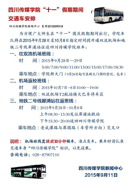 根据四川传媒学院“十一”国庆假期放假安排,学院交通车队将在2015年9月28日-10月8日指定时间段开通双流机场和地铁二号线犀浦站往返四川传媒学院交通车。具体安排如下: