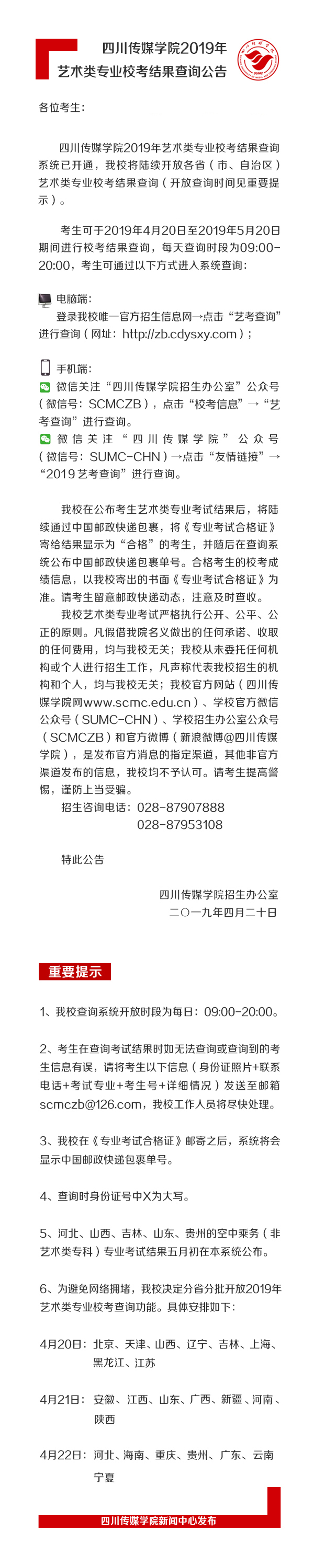 四川传媒学院2019年艺术类专业校考结果查询公告