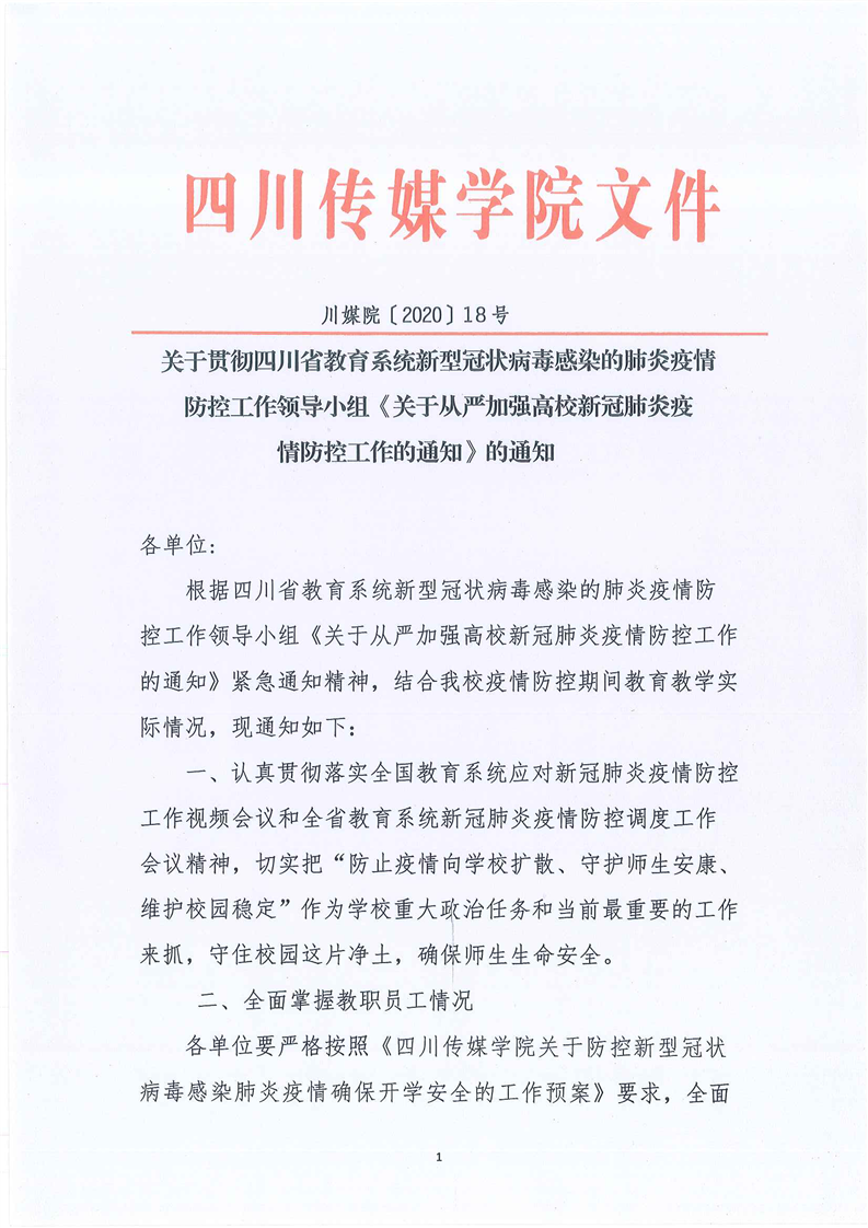 关于贯彻四川省教育系统新型冠状病毒感染的肺炎疫情防控工作领导小组《关于从严加强高校新冠肺炎疫 情防控工作的通知》的通知