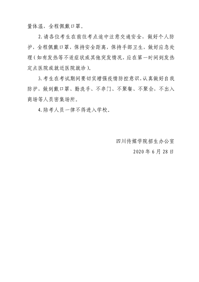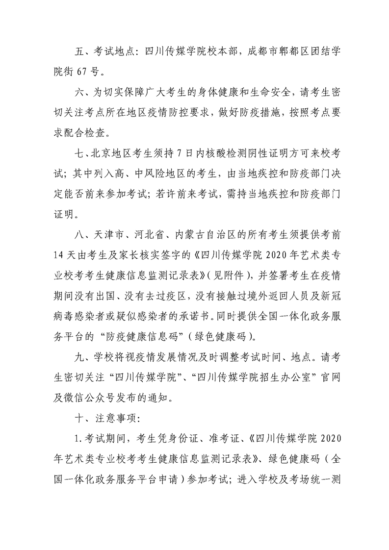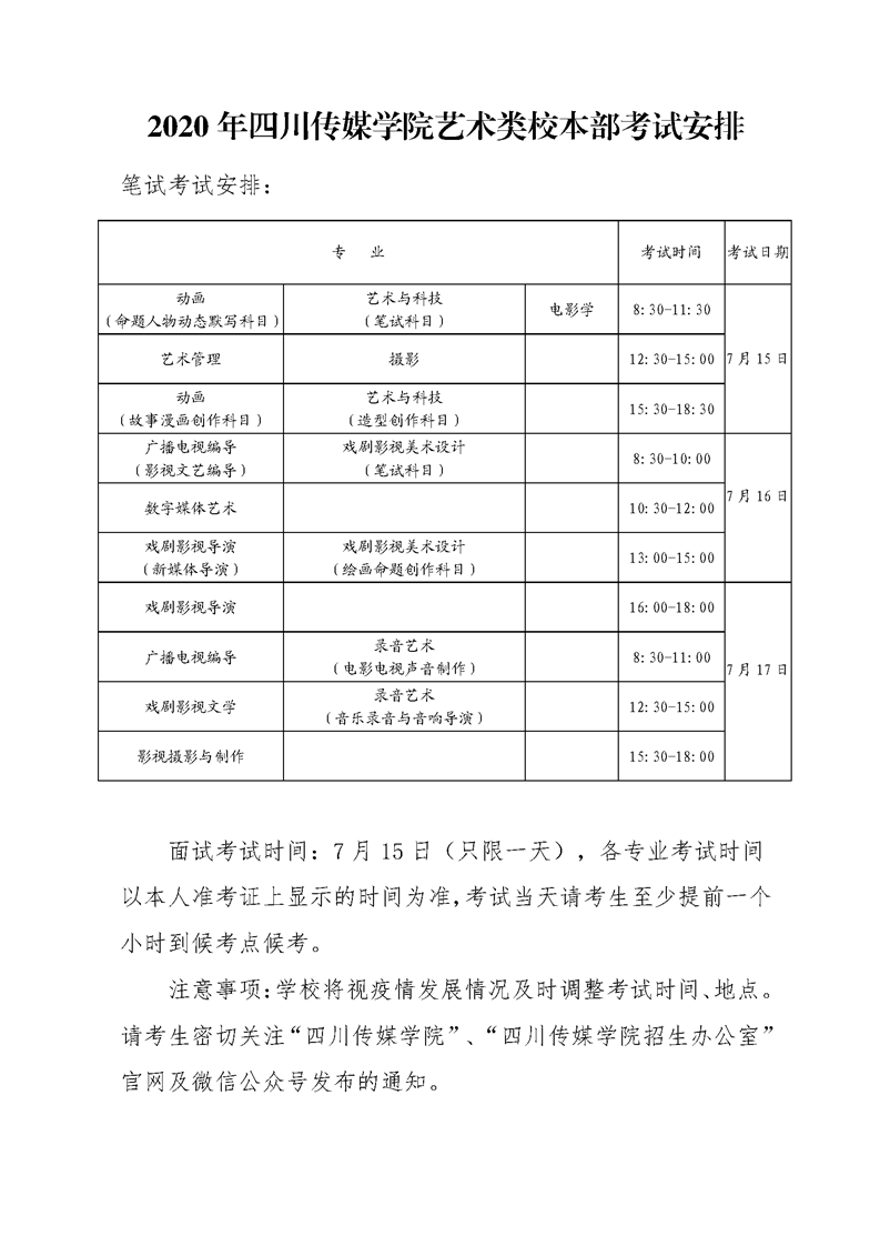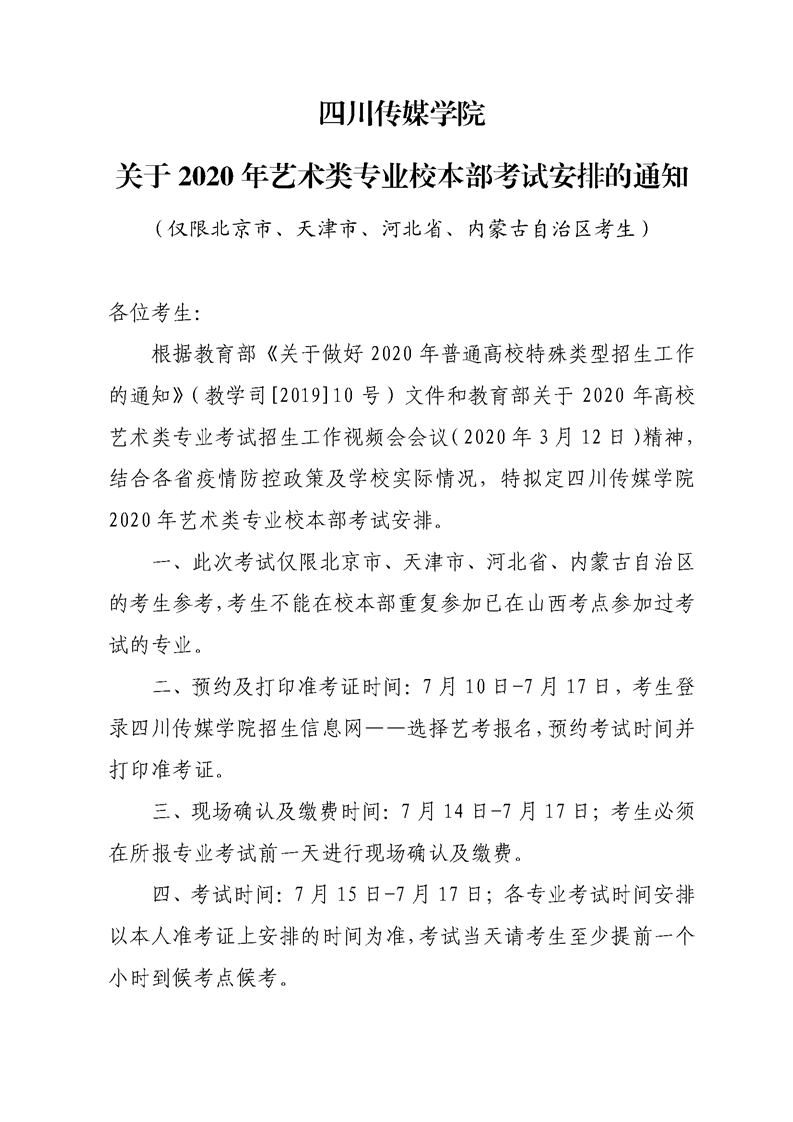 四川传媒学院关于2020年艺术类专业校本部考试安排的通知