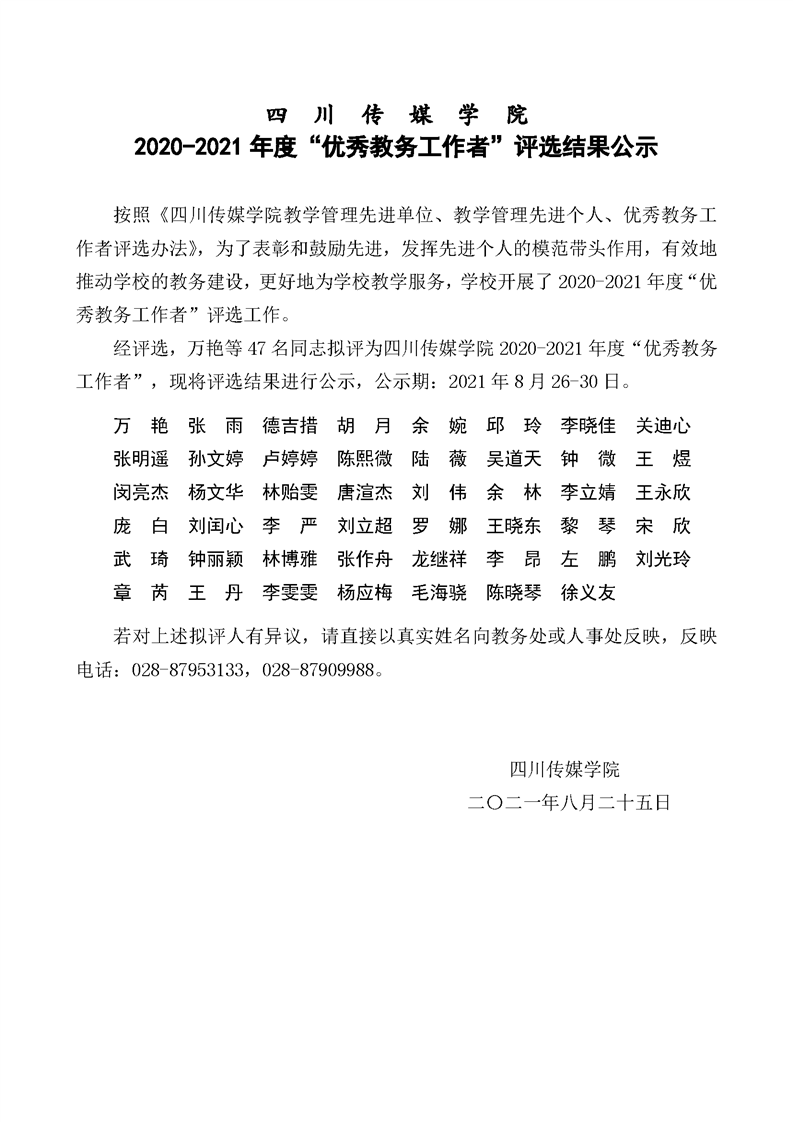 2020-2021年度“优秀教务工作者”评选结果公示