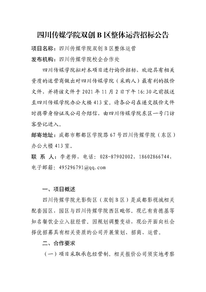 四川传媒学院双创B区整体运营招标公告