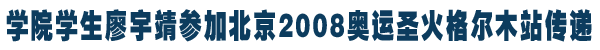 学院编导与戏剧影视文学系学生廖宇靖近日参加了北京2008奥运圣火格尔木站的传递,据了解,廖宇靖是在地震之后由于抗震救灾表现突出被三星集团选为奥运火炬手的。