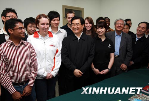 图为胡锦涛在学生宿舍楼同部分外国留学生亲切交谈。 新华社记者鞠鹏摄