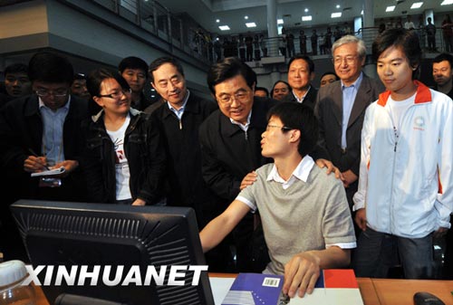 胡锦涛来到图书馆,走到学生们中间,大家非常欣喜,纷纷向总书记问好。胡锦涛微笑着与学生们握手,并同大家交谈起来,询问他们在念几年级、学什么专业。看到学生们专心致志学习的情景,总书记十分欣慰。