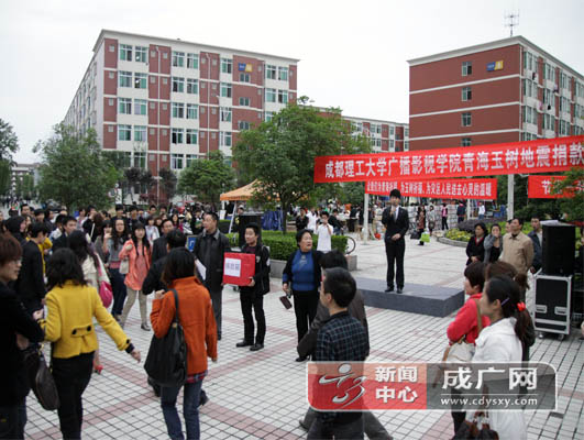 【新闻中心 浩睿】4月21日,青海玉树地震哀悼日。情系玉树,大爱无疆,成都理工大学广播影视学院向玉树地震灾区捐款仪式在学院红旗广场隆重举行,学院领导马洪奎、张书玉、薛丽华、陈祖继、王雷、黄梅子、董孝璧级学院各职能部门、各系师生参加了捐款仪式。