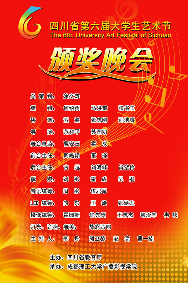 【新闻中心 孙浩睿】8月30日晚19:30,由四川省教育厅主办,成都理工大学广播影视学院承办的四川省第六届大学生艺术节闭幕式暨颁奖晚会在成都理工大学广播影视学院新艺体中心举行。