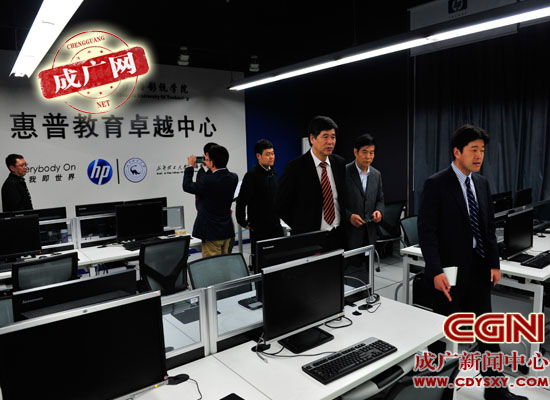 会谈之后,冈田一行还考察了学院中影院线,惠普卓越中心、联想创新中心、设备管理中心以及大录音棚等实践场所。