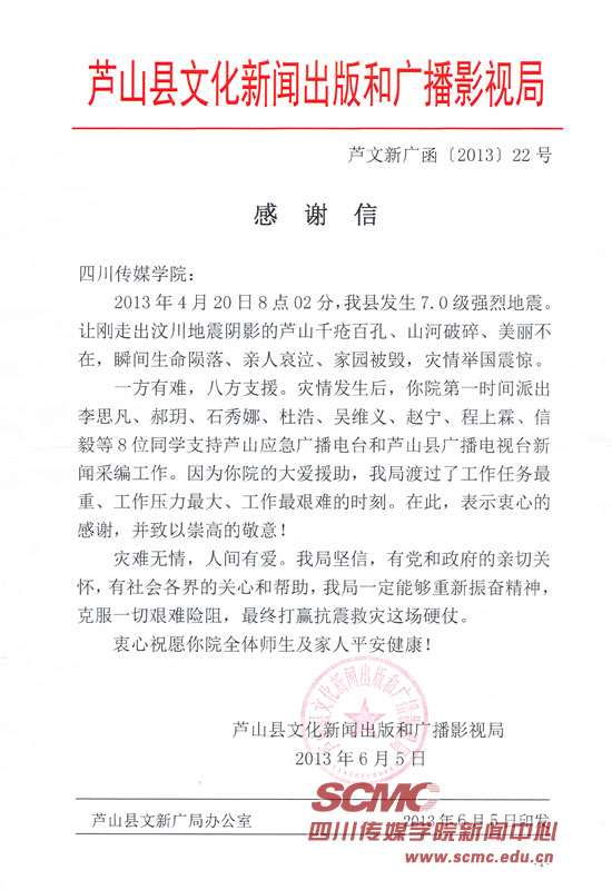 2013年4月20日8点02分,芦山县发生了7.0级强烈地震,让刚刚走出汶川地震阴影的芦山千疮百孔、山河破碎,灾情举国震惊。芦山县文新广局在感谢信中表示:因为四川传媒学院的大爱援助,该局渡过了工作任务最重、工作压力最大、工作最艰难的时刻。