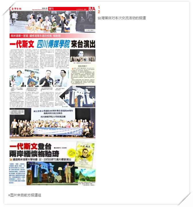 由四川省海峡两岸交流促进会和四川省文联支持,清华大学四川校友会与四川传媒学院联合出品的大型原创话剧《一代斯文》赴台湾新竹清华大学交流演出。在两岸清华大学分别建校105周年和60周年校庆的时候,共同缅怀以梅贻琦校长为代表的老一辈清华人,共同继承和发扬清华人家国天下的胸怀和为民族振兴的担当。