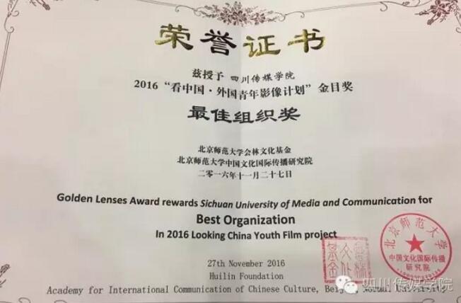 2016“看中国·外国青年影像计划”金目奖颁奖典礼近日在北京师范大学举行,四川传媒学院因承办“四川行”活动,被组委会授予“最佳组织奖”。由四川传媒学院学生担任制片人,新加坡青年导演拍摄的影片《杯中澜影》获得金目奖。四川传媒学院副校长冉光泽代表四川传媒学院受奖并在论坛上做专题演讲。校党委宣传部副部长孙浩睿参加颁奖典礼。