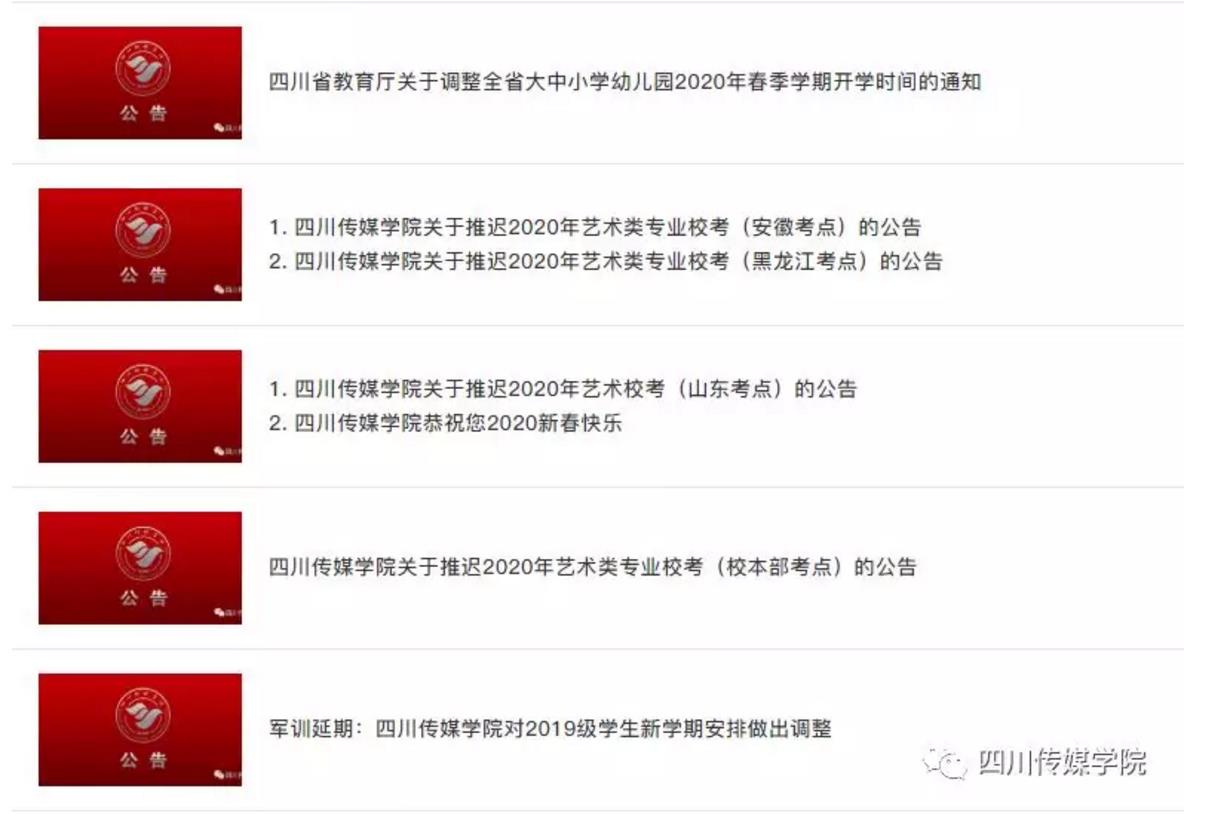 从1月22日起,学校先后发布2019级新生军训延期、2020级艺术类专业校考(校本部、山东考点、安徽考点、黑龙江考点)推迟进行的公告。与此同时,学校制定《四川传媒学院关于进一步做好新型冠状病毒感染的肺炎疫情防控有关事项》,并通过校园电子显示屏、张贴标语、辅导员逐个通知等方式,和微信、微博等新媒体工具,向分散在校内外的广大师生员工广泛发布,并确保师生员工人人知晓。学校还对湖北籍学生给予专门关怀和叮嘱,对校园实施半封闭式管理,在相关进出口处严格进行体温检测,以及严格落实“日报告”和“零报告”等相关规定。