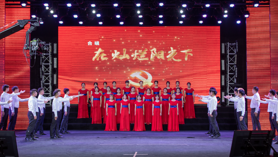 音乐系师生带来了合唱节目《在灿烂阳光下》。大会在全体参会同志高声合唱《没有共产党就没有新中国》中落下帷幕。