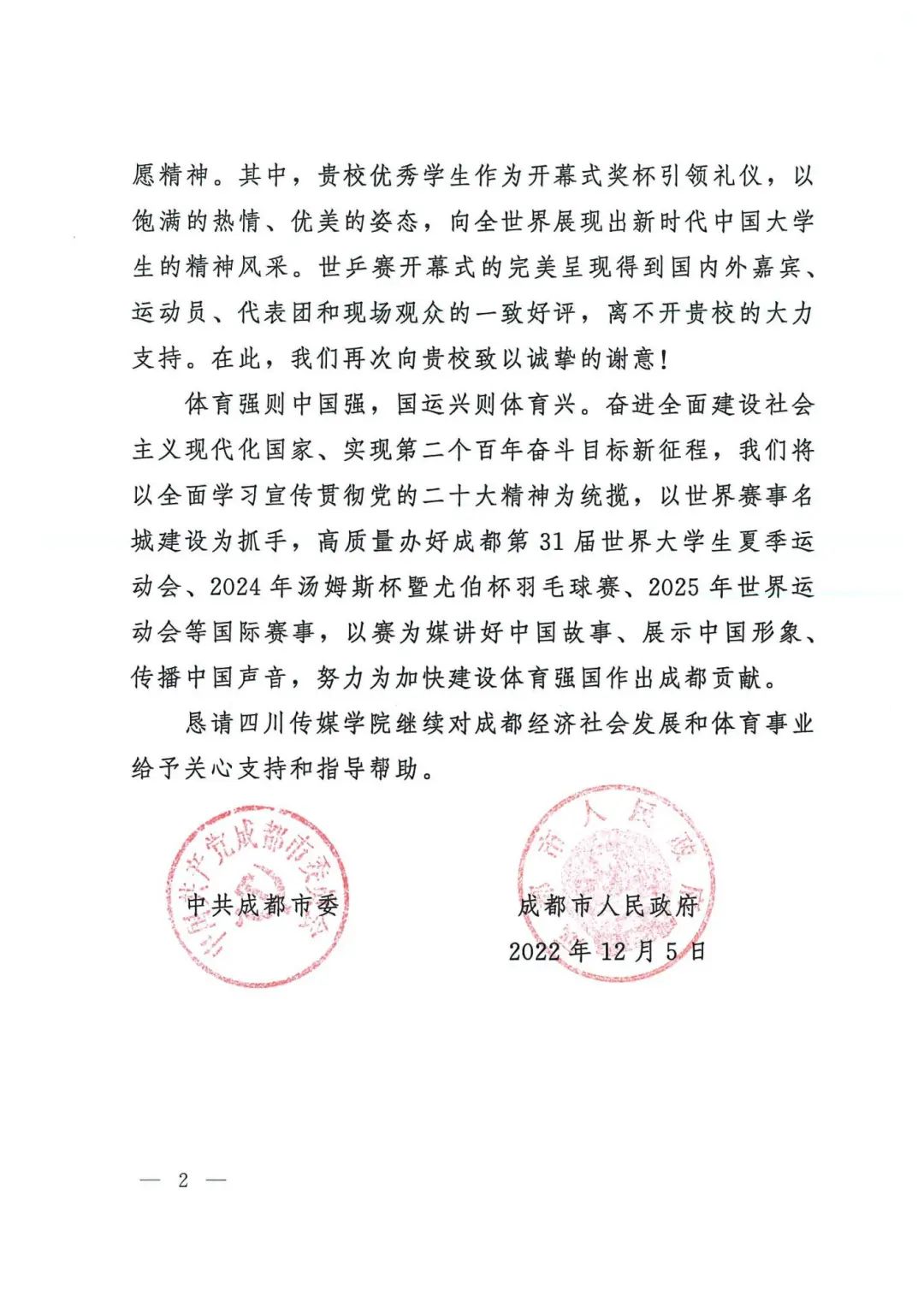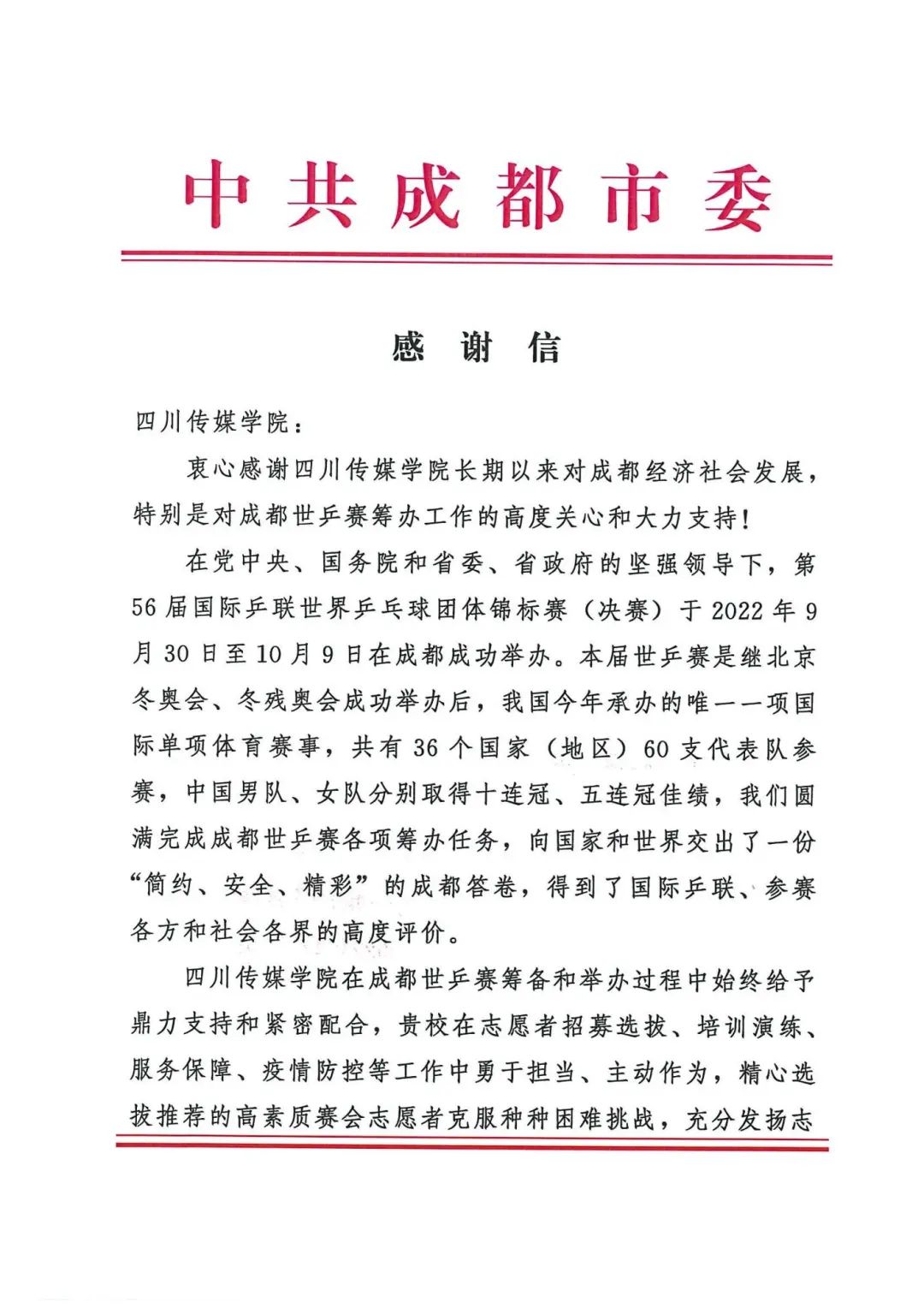 第56届国际乒联世界乒乓球团体锦标赛(决赛)于 2022年9月30日至10月9日在成都成功举办。赛事期间,我校在志愿者招募选拔、培训演练、服务保障、疫情防控等工作中协助组委会高水平、高质量的完成相关工作。特此,中共成都市委、成都市人民政府向我校发来感谢信,对我校在成都世乒赛中做出的贡献表示感谢。