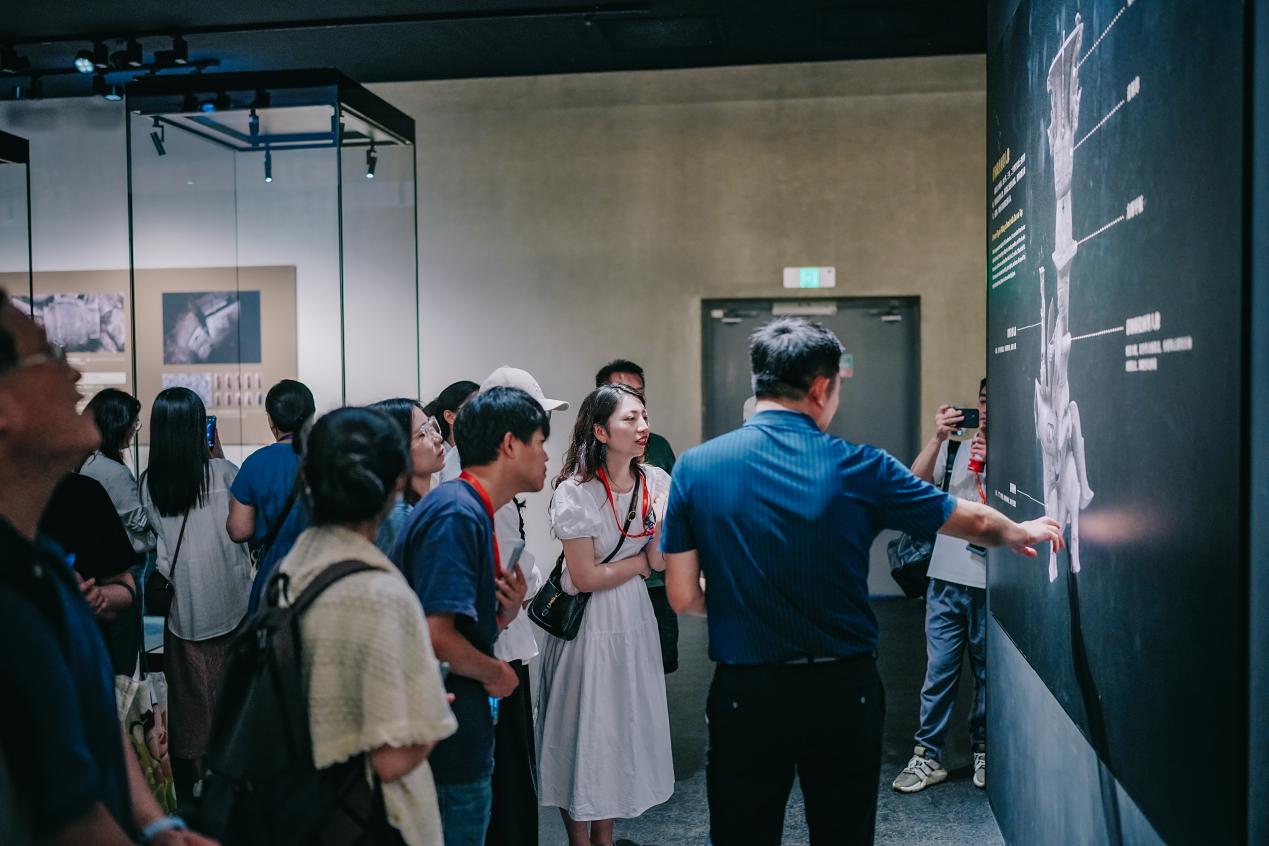 在沉浸式考察环节,教师们在任俊锋的带领下,探索了三星堆“世纪逐梦”“巍然王都”“天地人神”三个文化篇章,纵线式地穿梭于三星堆的过去、现在与未来。他们走近三星堆青铜神坛、青铜骑兽顶尊人像、青铜鸟足神像、通天神树等代表性文物,感知三星堆文化的神秘与魅力,并了解了三星堆展馆文化与科技融合的亮点,如AI技术与文化修复的结合、3D打印技术在文物保护中的运用等。这进一步引发了教师们关于如何用媒介、科技保护与推广三星堆文化的思考。