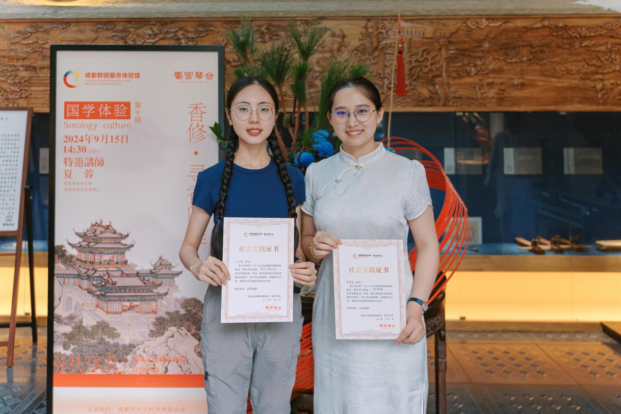 活动于中秋假期第一天9月15日下午,在古色古香的蜀宫琴台·音乐坊馆盛大举行。邹关调与戈心悦两位教师以学习者的姿态,在国家高级香艺师、非遗合香技艺传承人夏蓉的指导下,亲手体验了香丸与香珠制作的精妙过程,并最终获得“社会实践证书”。