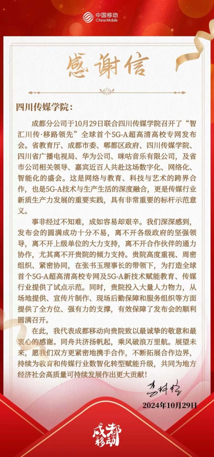数字化时代的浪潮正席卷全球,数字中国的宏伟蓝图正逐步变为现实。10月29日,“智汇川传-移路领先”全球首个5G-A超高清高校专网发布会在四川传媒学院举办。