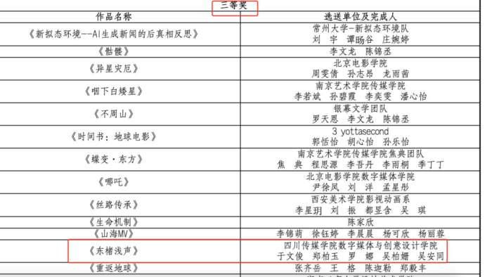 近日,由中国电影电视技术学会、中国传媒大学及北京电影学院联合主办的“中国创新影像大赛”获奖名单正式公布。四川传媒学院数字媒体与创意设计学院在此次大赛中表现卓越,三部作品成功入围生成式人工智能(AIGC)影像创新赛道,并荣获二等奖一项、三等奖两项。
