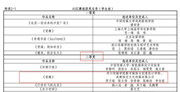 本次大赛中,四川传媒学院数字媒体与创意设计学院的周子超、张立伟、孙青杨、李伯宸等老师带领学生团队,凭借对AIGC技术的深入理解和独特创意,精心筹备并创作了多部优秀作品。其中,《觉醒》荣获二等奖,《东楮浅声》与《卡萨布兰卡》分别获得三等奖。这些作品不仅技术层面展现了生成式人工智能与影像创作的完美融合,更在创意表达和主题呈现上赢得了评委和观众的高度评价。