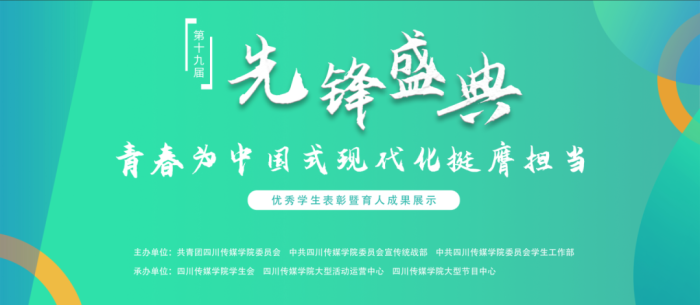 先锋盛典——优秀学生表彰暨育人成果展示活动(以下简称“先锋盛典”)作为四川传媒学院“校级校办”品牌校园文化活动,深度融入“大思政”工作体系,坚持在“三全育人”工作格局中发挥重要作用,突出“五育并举”,集思想政治引领、优秀学生表彰、育人成果展示为一体,以朋辈榜样示范为主要方式。表彰内容涵盖学生校园文化的各个领域,体现组织育人、文化育人、实践育人、网络育人的成果,全面展示校园文化,展现学生精神风貌,促进良好学风建设。