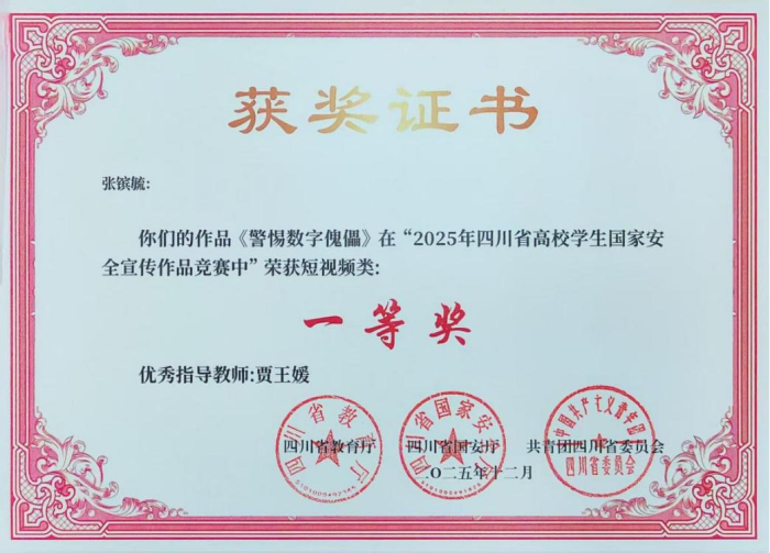 四川传媒学院有声语言艺术学院学生张镔毓制作的短视频《警惕数字傀儡》,获大赛短视频赛道一等奖,贾王媛老师获优秀指导教师荣誉称号。